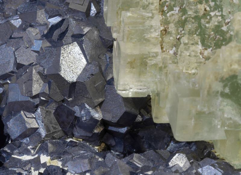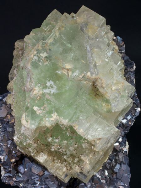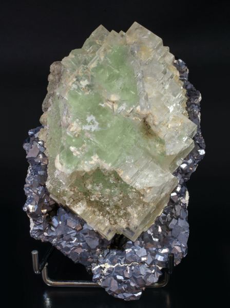 Polycrystalline growth of cubes of Fluorite crystals that are transparent and bright, have a uniform pale green color, are coated by small Calcite crystals and are on a matrix with cubo-octahedral Galena crystals. A magnificent classic of Mexican mineralogy.Naica, Municipio Saucillo, Chihuahua Mexico (±1998)