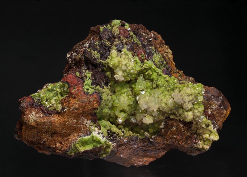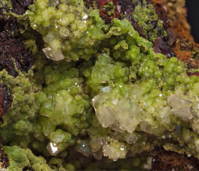 Botryoidal growths of micro-crystals of Duftite, some of them very well defined under a binocular microscope. They are clear green to slightly darker green and their luster varies from bright to dull, with transparent and colorless crystals of Calcite, and they coat a limonite matrix. Due to the absence of previous data about notable samples of Duftite at the Ojuela mine, we consider this find as an interesting "novelty" for this mine. The samples have been analyzed, and we'll send a copy of the analysis to the buyer.Ojuela Mine, Mapimí, Municipio Mapimí, Durango Mexico (2012)