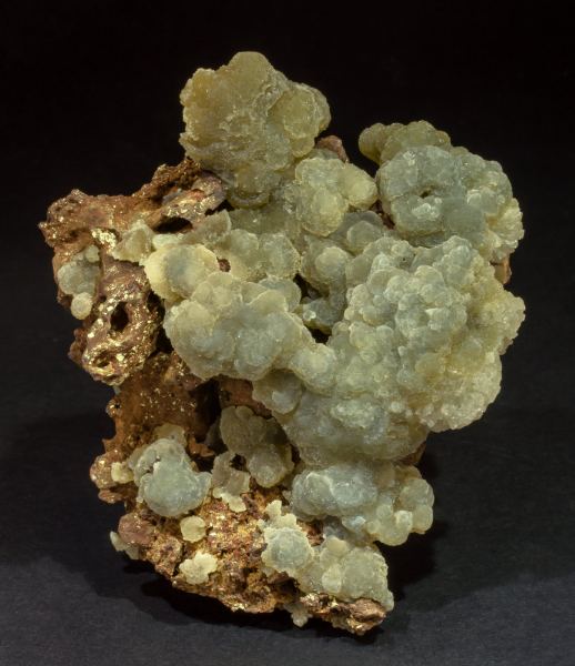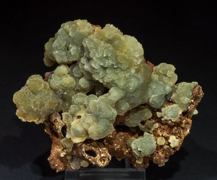 Spheroidal aggregates, on a limonite matrix, of intense green Austinite crystals (copper-bearing variety), covered by small white crystals of Adamite with a matte luster.Ojuela Mine, Mapimí, Municipio Mapimí, Durango Mexico