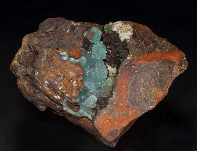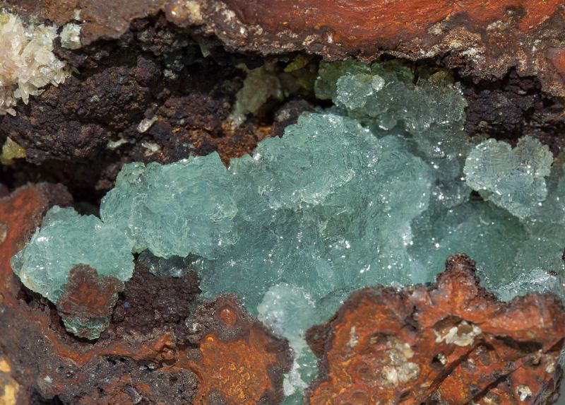 Spheroidal aggregates of small but very sharp Austinite crystals that are translucent, bright, with curved edges, and with slightly-bluish green color. They are on limonite matrix, with small Adamite crystals. The sample has been analyzed and we will send a copy of the analysis to the buyer.Ojuela Mine, Mapimí, Municipio Mapimí, Durango Mexico