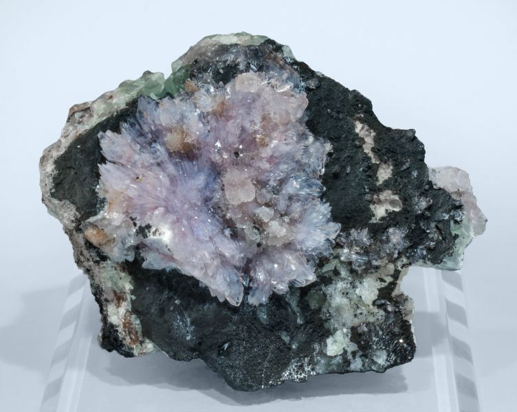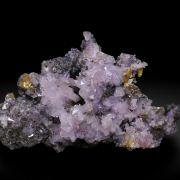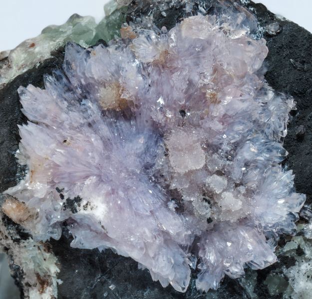 A novelty at Tucson 2020. Fan-shaped growths of short prismatic crystals of light violet Creedite, with very sharply pointed terminal faces, good luster, on matrix, with green Fluorite. This specimen is quite different from those that were known from this locality in recent years, although there are similar pieces from this mine in some old collections, which supports the indications that this find was made in old galleries of the mine.Navidad Mine, Abasolo, Rodeo, Municipio de Rodeo, Durango Mexico (10-12/2019)