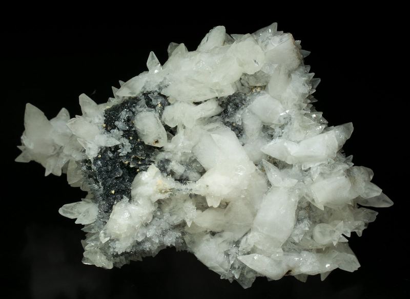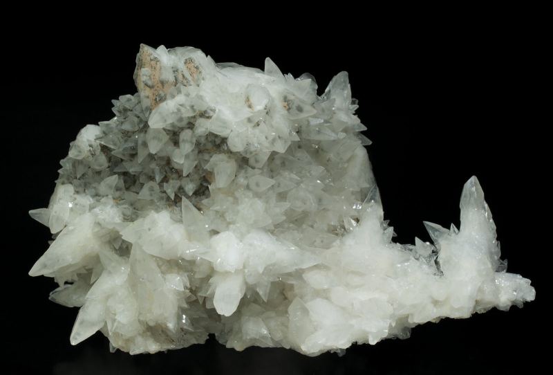 Cluster of very acute scalenohedral Calcite crystals. They are translucent and bright and are on matrix. The sample is from a not well known mine at Taxco from where such fine samples are scarce.Los Remedios Mine, Taxco de Alarcón, Municipio Taxco, Guerrero Mexico (±1988)