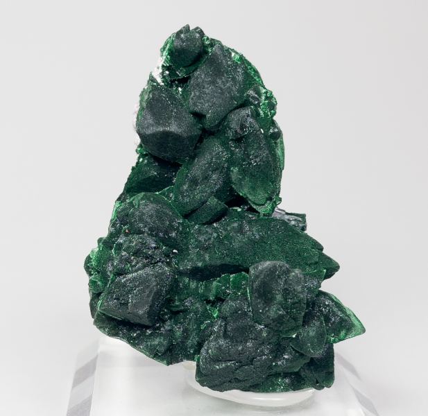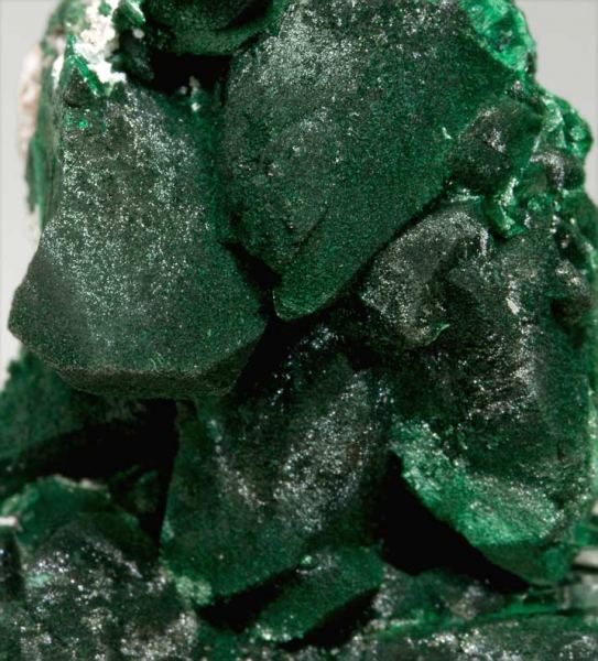 Aerial group of Malachite pseudomorphous after Azurite crystals, with rounded faces and edges, a very deep green color and silky luster.Milpillas Mine, Cuitaca, Municipio Santa Cruz, Sonora Mexico (2009)