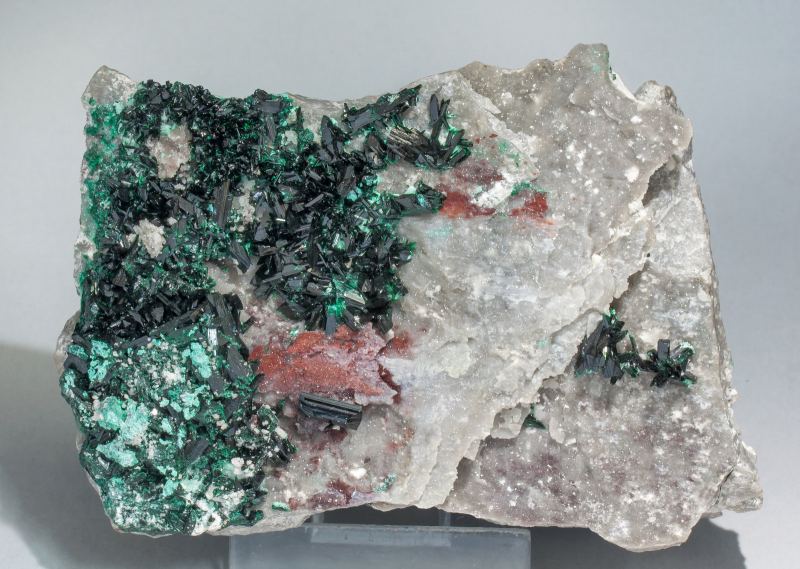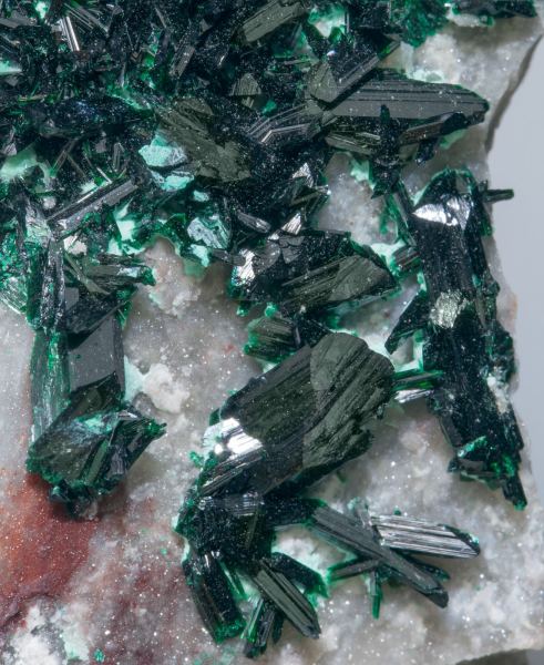 A novelty at Tucson 2015. Fibrous Brochantite is very well known at the Milpillas mine but this sample has aggregates of elongated idiomorphic crystals, one of them clearly isolated and doubly terminated, with very well defined faces and edges and chisel like terminations. In our opinion, the world's best for the species for their definition, crystal size, as well as their color and luster and, in general, very high quality.Milpillas Mine, Cuitaca, Municipio Santa Cruz, Sonora Mexico (07-08/2014)