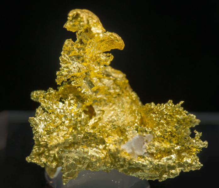 Dendritic growth of very bright laminar forms, on a small Quartz matrix. The sample is an excellent thumbnail from a locality that is practically unknown for collectible gold samples.La Ciénega, Municipio de Pitiquito, Sonora Mexico