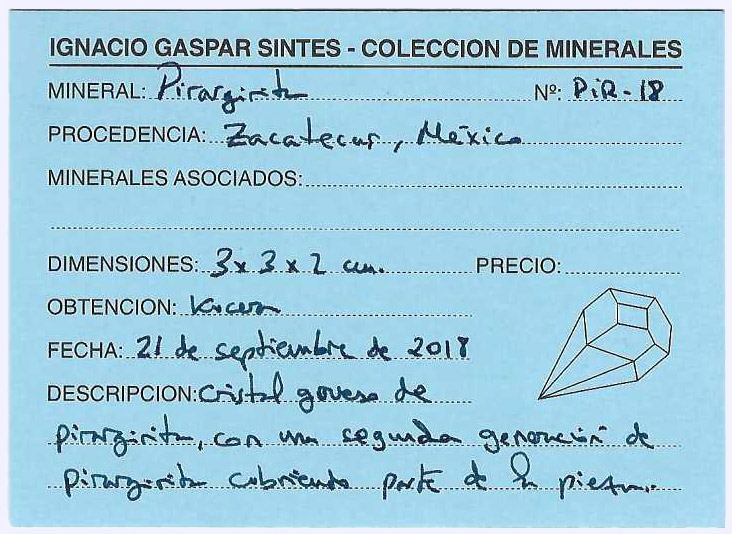 Pyrargyrite crystal of good size with very marked parallel growths and flat terminations, and with a second generation of microcrystals of more Pyrargyrite.The specimen comes from the Ignacio Gaspar collection (number PIR-18), whose label we will send to the buyer. The crystal has been analyzed and we will send a copy of the analysis to the buyer too.