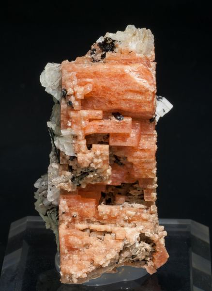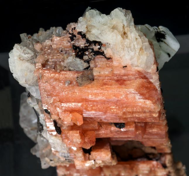 Parallel growth of Serandite crystals with very well defined faces and edges and an intense color. They are implanted on a matrix of laminar Albite and have thin black Aegirine crystals scattered about.Poudrette Quarry, Mont Saint-Hilaire, La Vallée-du-Richelieu RCM, Montérégie, Québec Canada (1984)