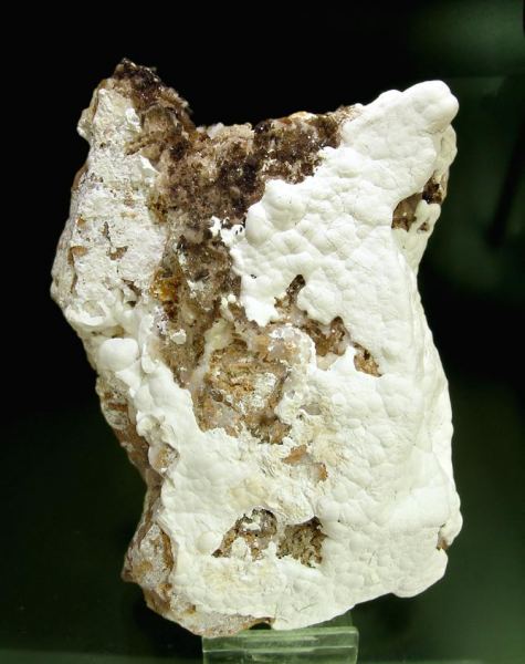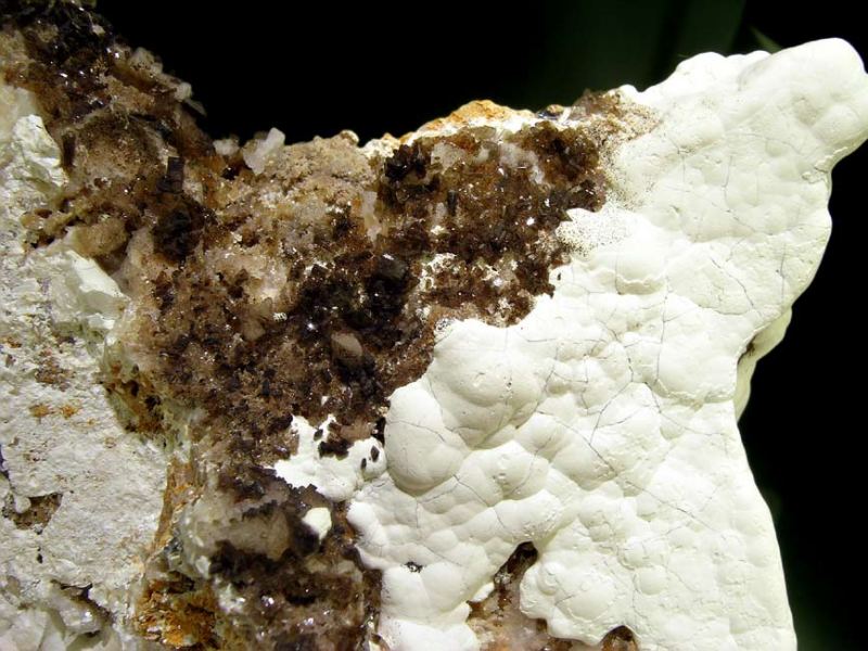 Small prismatic crystals of Hemimorphite, dark brown, very sharp and bright, partially covered by a botryoidal uniform bed of white Hydrozincite.La Florida mining area, Herrería-Valdáliga-Rionansa, Comarca Costa Occidental/Saja-Nansa, Cantabria Spain (1997)