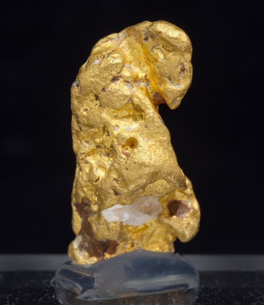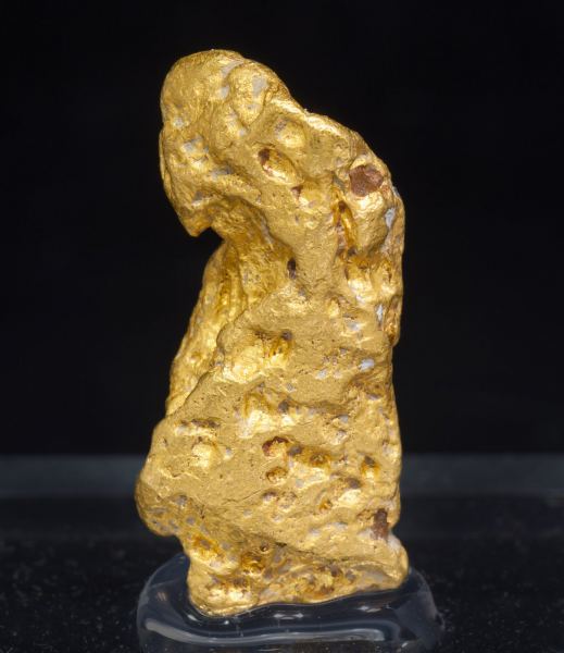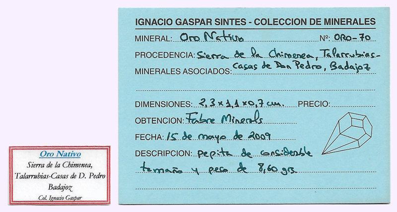 Gold nugget with an elongated shape that retains rounded and deformed cubic crystals on the back. A representative of Spanish Golds, seldom easy to get.The specimen is from the Ignacio Gaspar Sintes collection, whose label and catalogue entry we will send to the buyer.