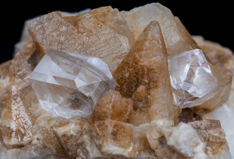 Two Fluorite crystals with clearly dominant cube faces and a very well defined dodecahedral bevel. They are very clear, bright and colorless and are on a matrix of brown scalenohedral Calcite crystals.Llamas Quarry, coquera del tubo, Obdulia vein, Caravia mining area, Las Cabañas, Duyos, Caravia, Comarca Oriente, Principality of Asturias (Asturias) Spain (04/2017)