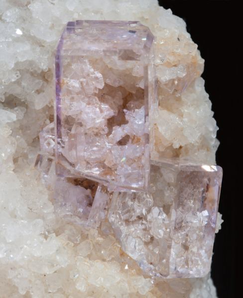 Group of three crystals with the clearly dominant cube faces, beveled by the dodecahedron. They are extremely clear and bright, with a pale lilac color and on a Quartz matrix coated by small crystals of the same mineral.Llamas Quarry, Obdulia vein, Caravia mining area, Las Cabañas, Duyos, Caravia, Comarca Oriente, Principality of Asturias (Asturias) Spain