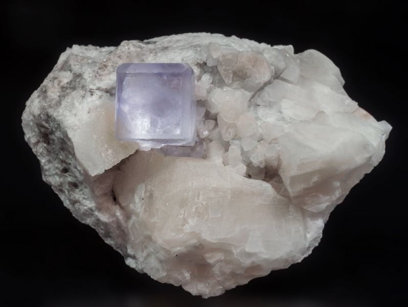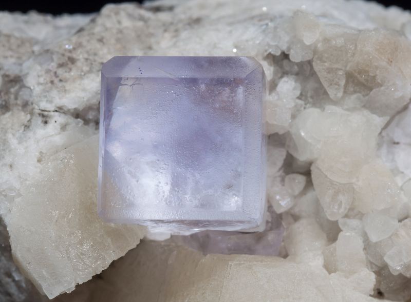 Single cubic crystal clearly beveled by the faces of the dodecahedron. It has very well defined faces and edges, is transparent with a pale lilac color and is implanted on a matrix with white scalenohedral Calcite crystals. This matrix has a partially sawn back to avoid it being broken while it was trimmed.Llamas Quarry, Obdulia vein, Caravia mining area, Las Cabañas, Duyos, Caravia, Comarca Oriente, Principality of Asturias (Asturias) Spain