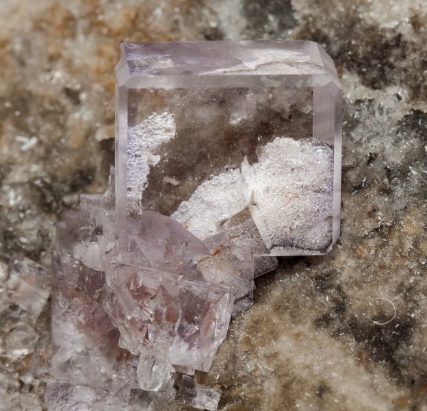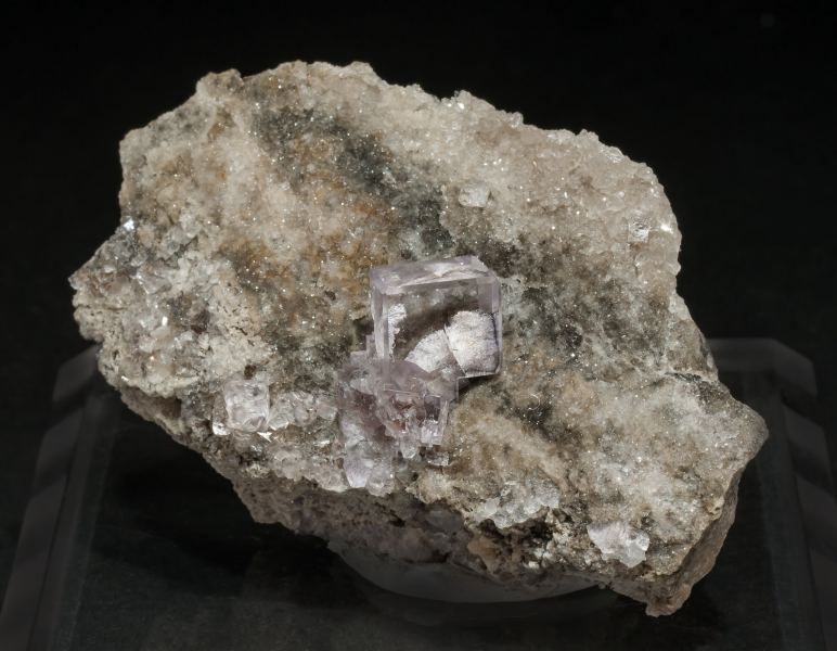 Group of Fluorite crystals, one of them clearly dominant, cubic and clearly beveled by dodecahedron faces. Water-clear, very shiny, with a pale lilac color and on matrix with Quartz crystals. A Spanish classic. The specimen has been sawn on the back to remove excess matrix.Llamas Quarry, Obdulia vein, Caravia mining area, Las Cabañas, Duyos, Caravia, Comarca Oriente, Principality of Asturias (Asturias) Spain