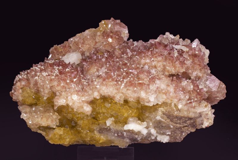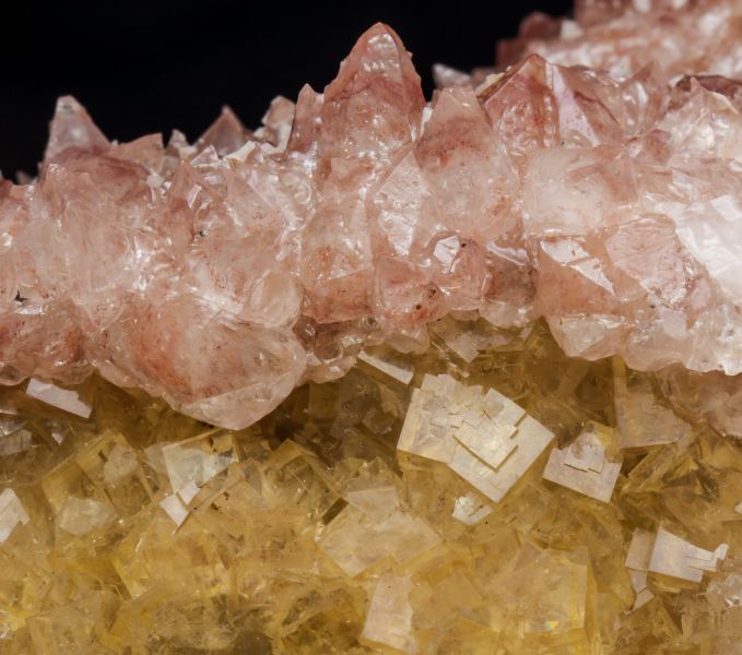 Two generations of Calcite coexist in the specimen, partially covering a group of transparent, lustrous and intense yellow Fluorite crystals. The later of these Calcite generations forms poorly defined white crystals, while the first forms a coating of translucent, bright, scalenohedral crystals, colored reddish by Hematite inclusions.Moscona Mine, El Llano, Solís, Corvera de Asturias, Comarca Avilés, Principality of Asturias (Asturias) Spain (2010)