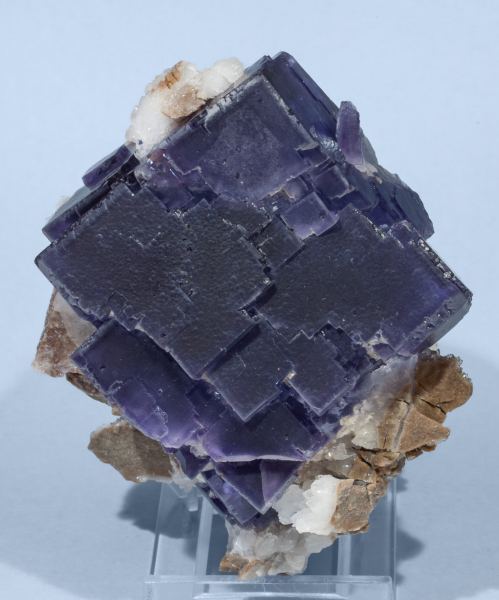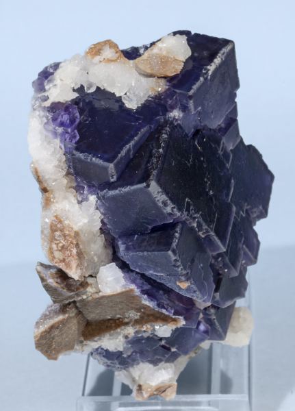 Group of cubic crystals beveled by the polycrystalline surfaces of the dodecahedron. They are translucent and have a violet color with geometric color zoning. On matrix with small white Quartz crystals. A Spanish classic.La Viesca Mine, La Collada mining area, Huergo, Siero, Comarca Oviedo, Principality of Asturias (Asturias) Spain (2007)