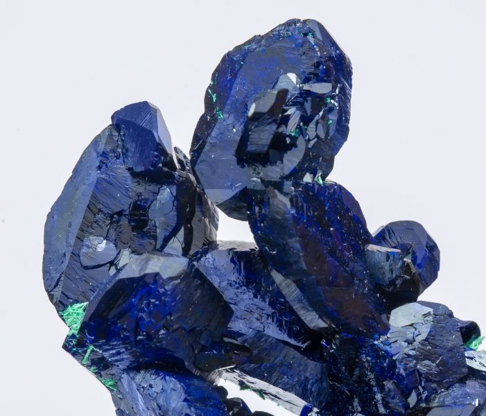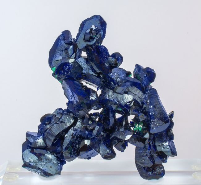 Very aerial aggregate of thick crystals, with an elongated lenticular habit, very sharp crystal forms with slight curvatures, on Azurite matrix. Has a deep blue color (electric blue) typical of the best Milpillas specimens. With transparencies on the edges and a very intense luster. The aggregate is partially covered on the back by aggregates of fibrous Malachite crystals with a silky luster, very characteristic of the famous Milpillas vug that yielded such isolated crystals with this lenticular habit and with fibrous Malachite on the back of most of that vug's specimens.Milpillas Mine, level 1280, Cuitaca, Municipio Santa Cruz, Sonora Mexico (2016)