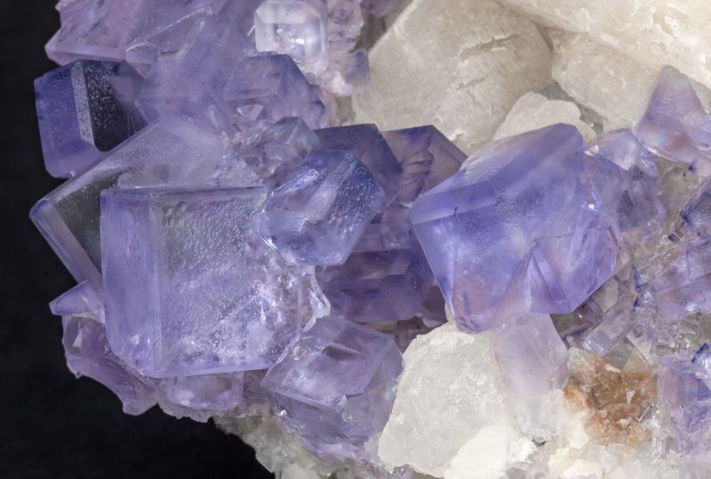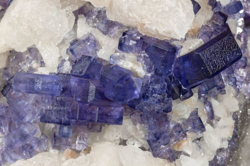 Aggregates of Fluorite crystals with a cubic habit, bevelled by dodecahedron faces, transparent, with good luster and a very deep and uniform violet color, with that unusual vividness displayed by specimens from this locality. Implanted on a matrix of scalenohedral Calcite crystals.Llamas Quarry, Obdulia vein, Caravia mining area, Las Cabañas, Duyos, Caravia, Comarca Oriente, Principality of Asturias (Asturias) Spain