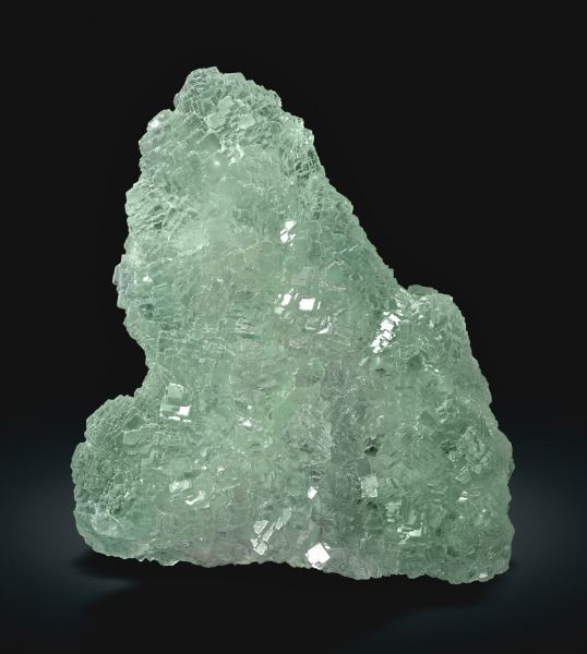 Very aerial druse of very sharp Fluorite crystals, rich in polycrystalline growths, extraordinarily transparent and lustrous and with a uniform pastel green color.The specimen, of the best quality for this classic French locality, came from the Alain Martaud collection.