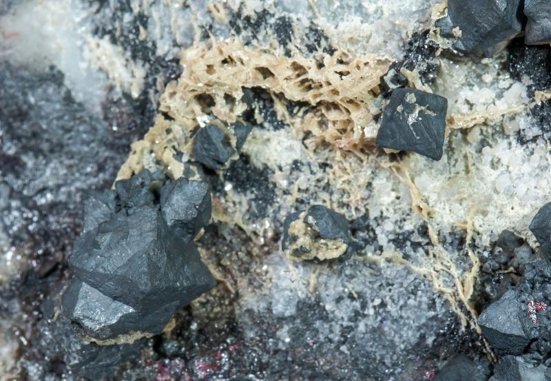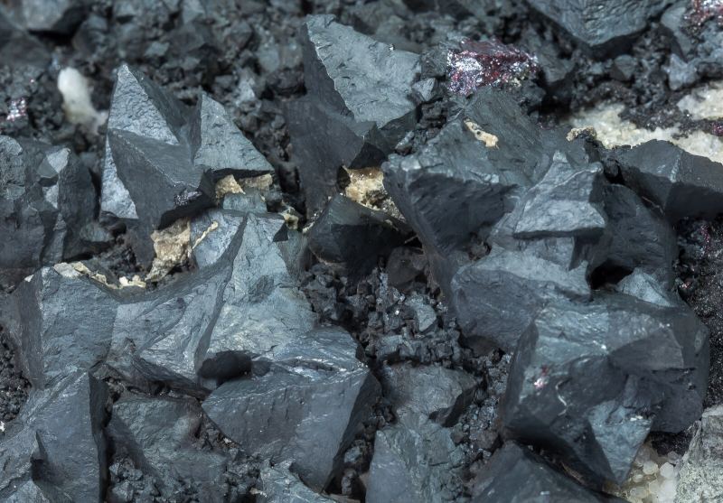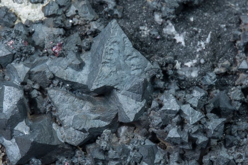 Acanthite crystals on matrix, very sharp, with coatings in some areas of yellow Siderite. Proustite is also present and in general the specimen is notable both for the definition of the Acanthite crystals and for the fact that they are on a rock matrix, which is very rare in this deposit.Imiter Mine, Jebel Saghro, Imiter District, Tinghir Province, Drâa-Tafilalet Region Morocco (2020)