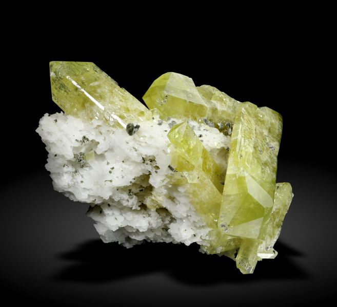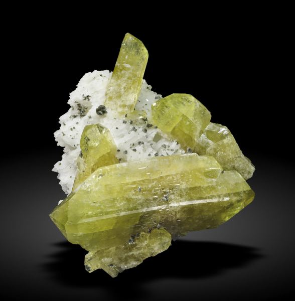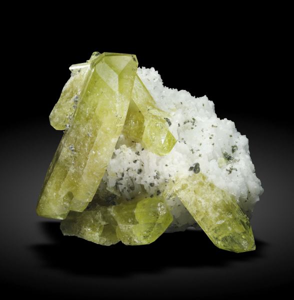 Large doubly terminated and very sharp Brazilianite crystals, transparent, with good luster and a very vivid color and on an Albite matrix. Partially covered with small, very sharp crystals of Greifensteinite, a rare phosphate of calcium, iron, and beryllium.Telírio claim, Linópolis, Divino das Laranjeiras, Vale do Rio Doce, Minas Gerais Brazil