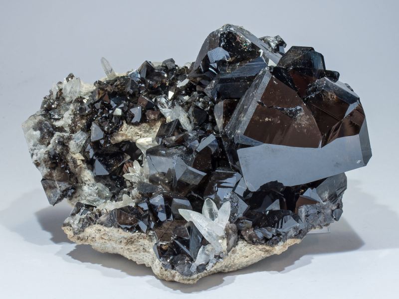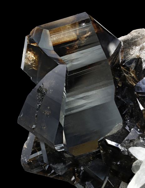 Twinned Cassiterite crystals, on matrix, with Quartz crystals. The crystals have very well defined faces and edges, they are transparent to translucent and dark brown in color. The luster and size of the crystal are extraordinary. One of the best pieces found in this locality.Amo deposit, Ximeng, Pu'er Prefecture, Yunnan Province China (2002)