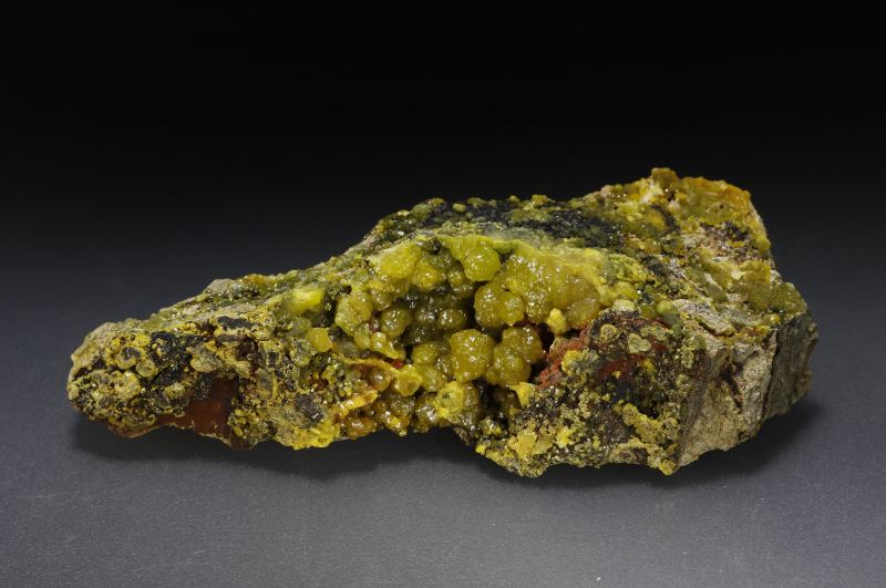 Mimetite crystals of a spheroidal habit with curved faces and edges, greenish yellow in color, on a rock matrix. This lead arsenate-chloride specimen comes from the outer zone of the South Filón cut in Tharsis.Filón Sur open pit (external), Minas de Tharsis, Tharsis, Alosno, Comarca El Andévalo, Huelva, Andalusia Spain (30/04/2017)
