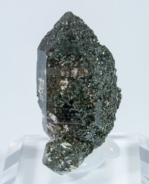 Quartz crystals (variety smoky), one of them clearly dominant, doubly terminated, with well-defined faces and edges, with external and internal inclusions of deep green Chlorite crystals, which give some of the Quartz crystal faces a rough appearanceDodo Mine, Saranpaul, Khanty-Mansi Okrug, Tyumen Oblast Russia