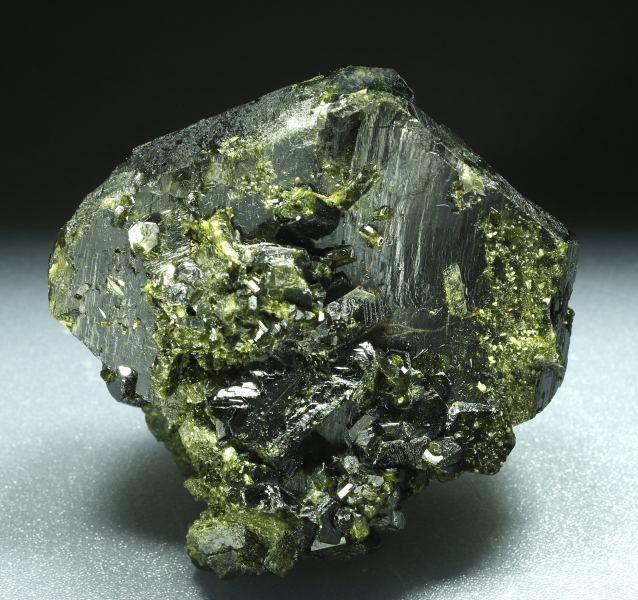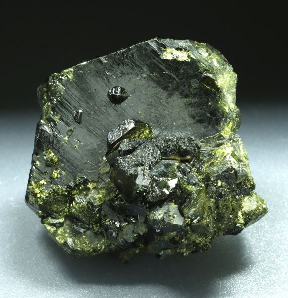 Group of crystals, of pistachio green color, with very simple forms but with a very uncommon habit, the predominance of a very well developed frontal pinacoid that results in the crystal being really smooth. The crystals are bright and deep green, almost black. This specimen was a novelty at Sainte Marie-aux-Mines 2011.Raywoo Mine, Quetta District, Balochistan (Baluchistan) Pakistan (2011)