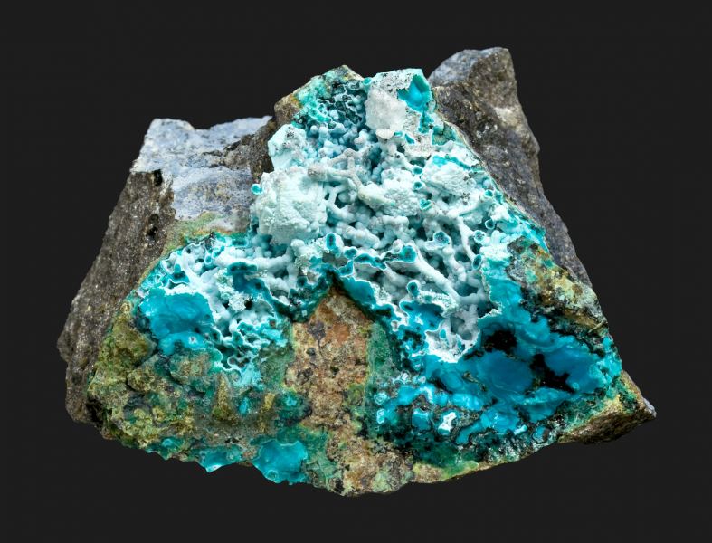 Aggregate on matrix of Chrysocolla pseudomorphs after small crystals of Boleite and also forming concretions and botryoidal growths. This rare pseudomorph was discovered a few years ago in an area near Amelia (not in the mine itself), but until the end of 2010 new samples had not been recovered.Manto 3, Santa Rosalía (El Boleo), Boleo District, Municipio Mulegé, Baja California Sur Mexico(10-12/2010)