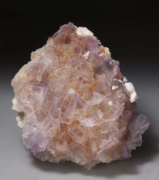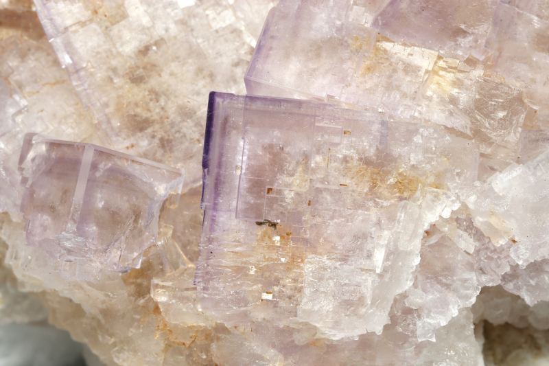 Druse of cubic Fluorite crystals, pale purple color, with dark color zoning on the edges of some cubes, on matrix, with Quartz and Calcite crystals.Llamas Quarry, Obdulia vein, Caravia mining area, Las Cabañas, Duyos, Caravia, Comarca Oriente, Principality of Asturias (Asturias) Spain (2010-2011)
