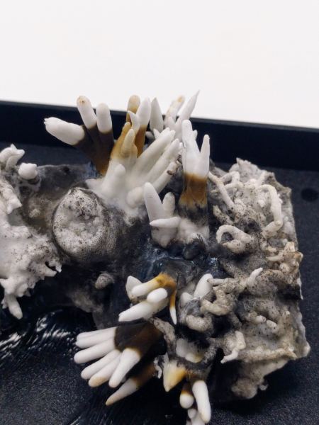 Coraloidal crystal growths of the flos ferri variety, with dark color at the base and snow white at the terminations. The larger crystal displays an empty cavity inside.Bovegno, Trompia Valley, Brescia Province, Lombardy Italy (2009-2010)