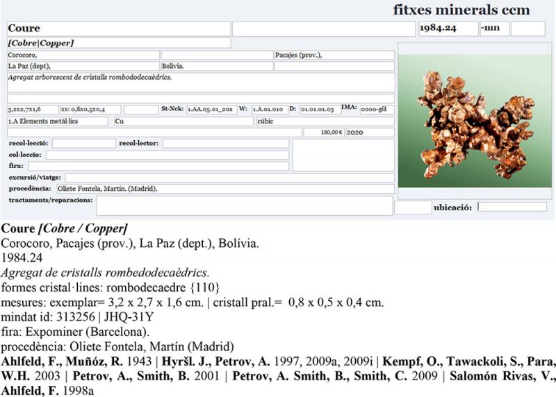 Arborescent growth of very shiny Copper crystals with very well defined dodecahedron forms. An excellent miniature that comes from the Carles Curto collection (number 1984.24), whose label and computer file we will send to the buyer.Corocoro, Pacajes Province, La Paz Department Bolivia