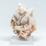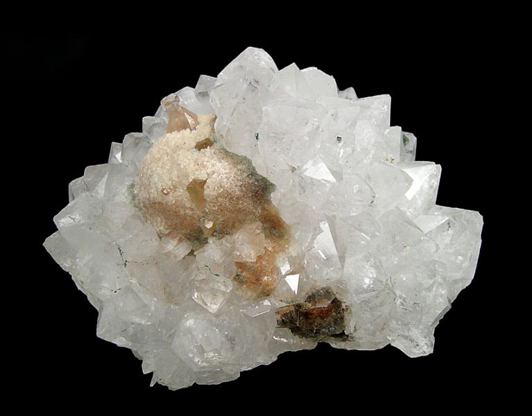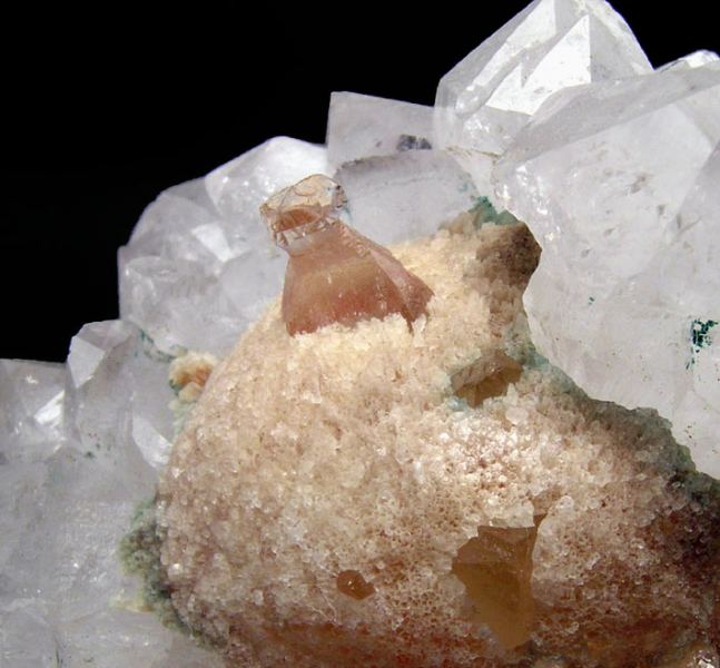 Between the Quartz crystals appears a sphere of Fluorite and, furthermore, from the same sphere starts some sceptered Quartz, different in its color and shape to the Quartz on the matrix. The lower part of the piece is hollowed, as if it growth was covering an older material.Mahodari, Nashik District (Nasik), Maharashtra India (±2000)