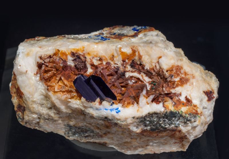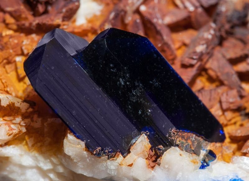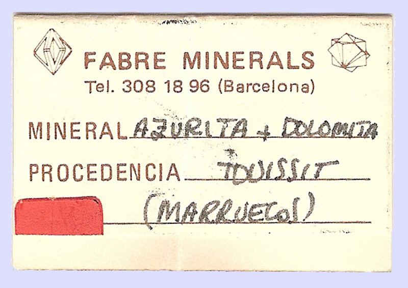 Parallel growth of two very sharp Azurite crystals that are translucent, on matrix, with a very deep color with vivid transparencies and reflections and on rhombohedral Dolomite crystals with limonite coatings. A classic from Touissit, very probably, one of the latest to be incorporated in the Daunis collection by Daunis wife Maria. Well send to the buyer an old commercial label that is with the sample.Touissit, Touissit District, Jerada Province, Oriental Region Morocco