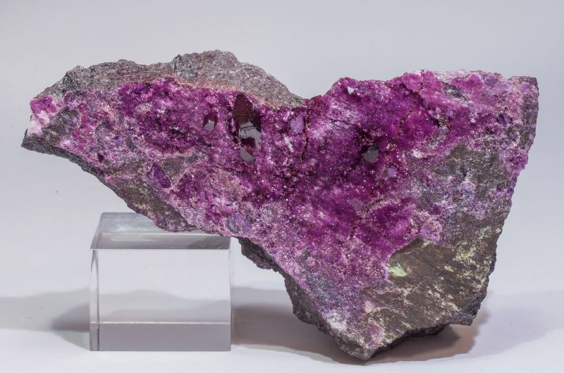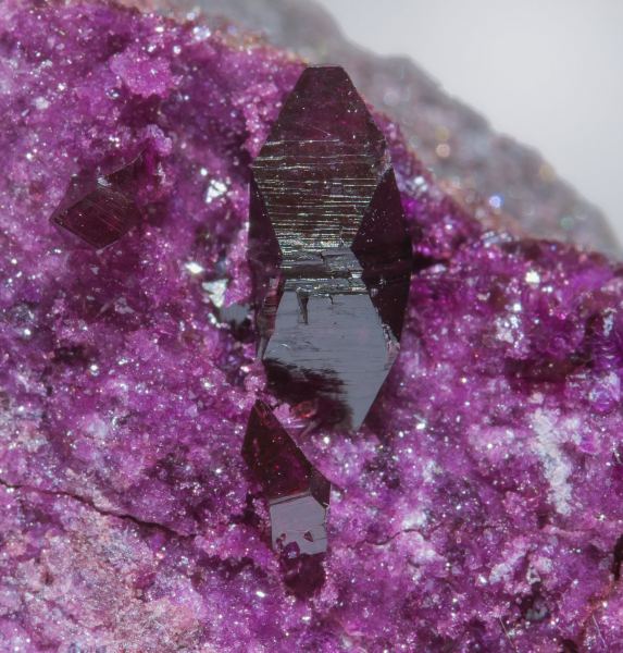 Druse on matrix of twinned crystals of Chromium-bearing Clinochlore (variety kämmererite)They have a bipyramidal habit, translucent, with good luster and an intense deep mauve color. A classic of Turkish mineralogy.