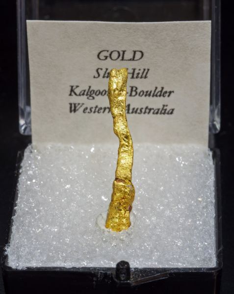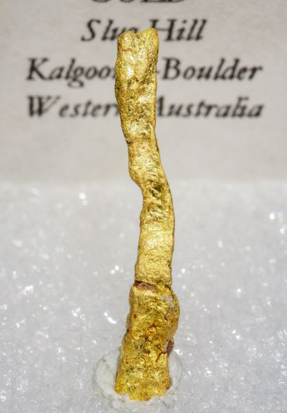 Very elongated growth, with parallel growths and slight twists, of Gold crystals with defined terminal faces, from one of the great classic Australian localities.We will send the specimen in the original Perky box from the Robert J. Noble collection, which also contains the label.