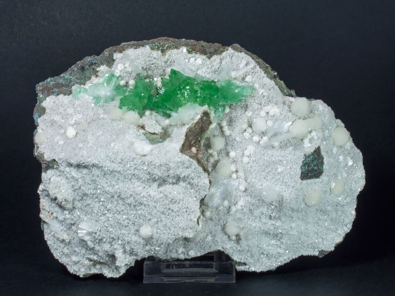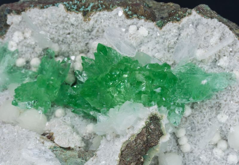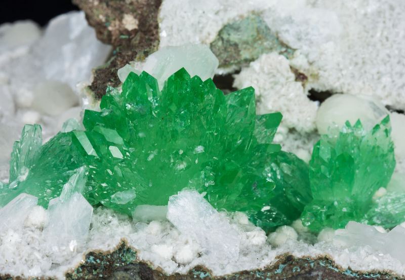 Group of Fluorapophyllite-(K) crystals with the forms of a prism and a very steep sharp bipyramid, transparent, with a bright luster and an extraordinarily vivid and intense green color. On a basalt matrix covered with white spheroidal aggregates of Stilbite-Ca and white lamellar crystals, with a silky luster, of Heulandite-Ca. Old piece, from the 1970s.Pune District (Poonah District), Maharashtra India