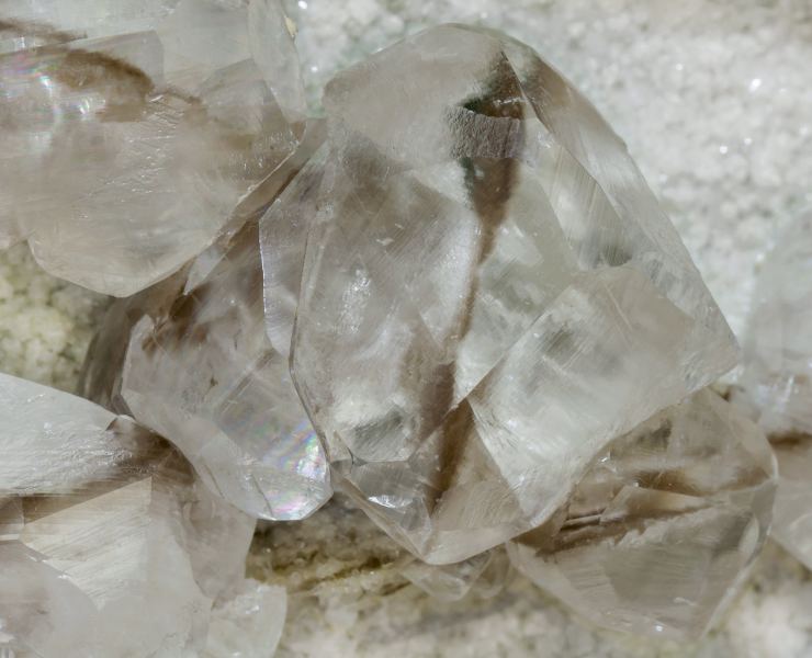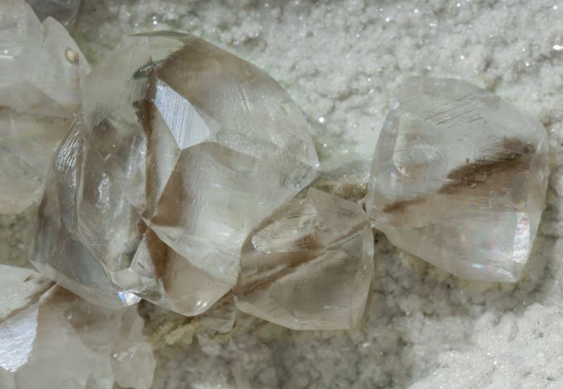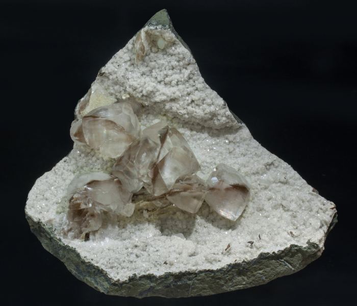 Aggregate of complex equant Calcite crystals that are transparent and very bright, with oriented dark colored inclusions and implanted on a basalt matrix coated by white Quartz microcrystals.Malad, Mumbai (Bombay), Mumbai District (Bombay District),, Maharashtra India