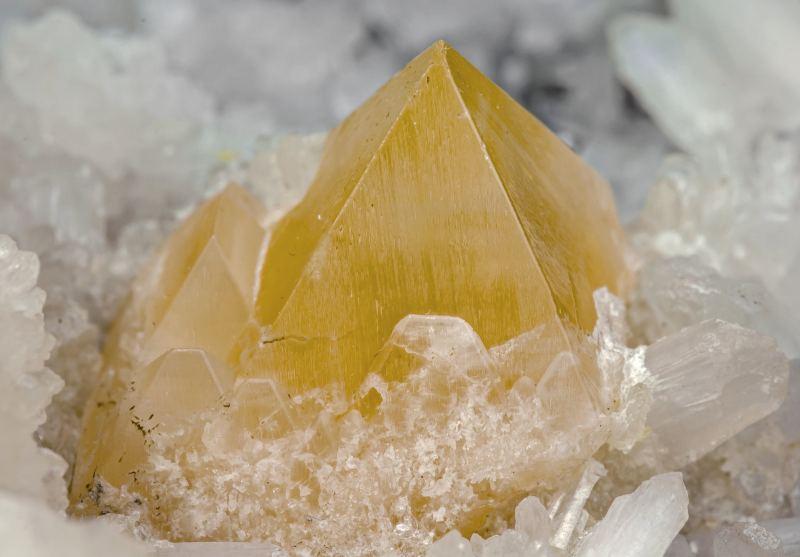 Very sharp Powellite crystals in parallel growth, translucent with a cream color. They are on a basalt matrix with Stilbite-Ca crystals, partially doubly terminated white Fluorapophyllite-(K) crystals and transparent rhombohedral Calcite crystals, one of them clearly dominant.Jalgaon District, Maharashtra India (± 2010)