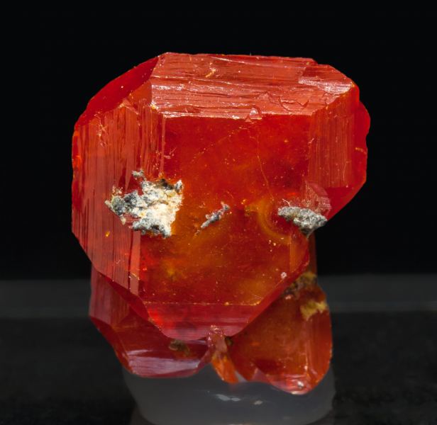Group of highly profiled lamellar crystals of Wulfenite on matrix, one of them clearly dominant, very rich in crystal forms, translucent, with very good luster and with an extremely vivid and intense red color.Chah Kharboze Mine, Chah Kharboze, Anarak District, Nain, Isfahan Province Iran (08/2015)