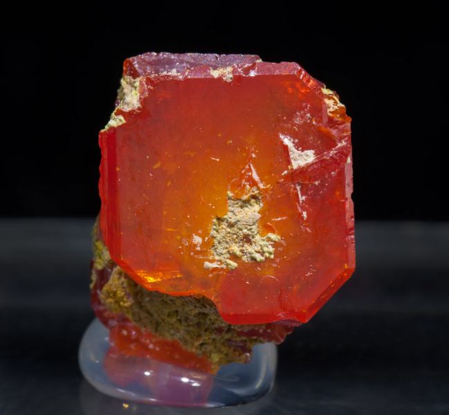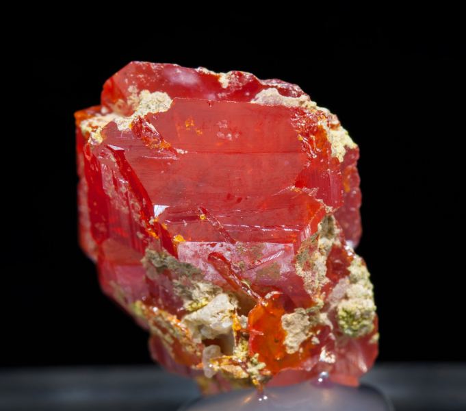 Aggregate of two tabular crystals. They are translucent, very bright, have an extraordinarily vivid and intense red color and are on a small matrix.Chah Kharboze Mine, Chah Kharboze, Anarak District, Nain, Isfahan Province Iran (08/2015)