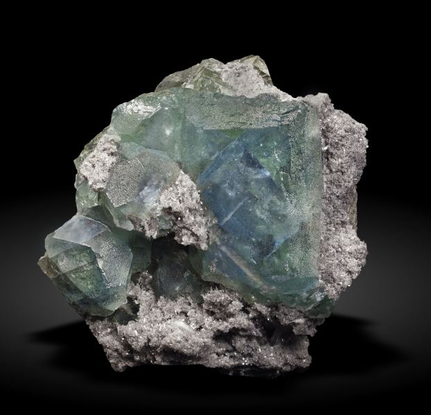 Cubic crystals clearly beveled by dodecahedron faces, transparent, very shiny, and somewhat bicolored between blue and green. On matrix, with small Quartz crystals.Quanzhou Prefecture, Fujian Province China (2018)