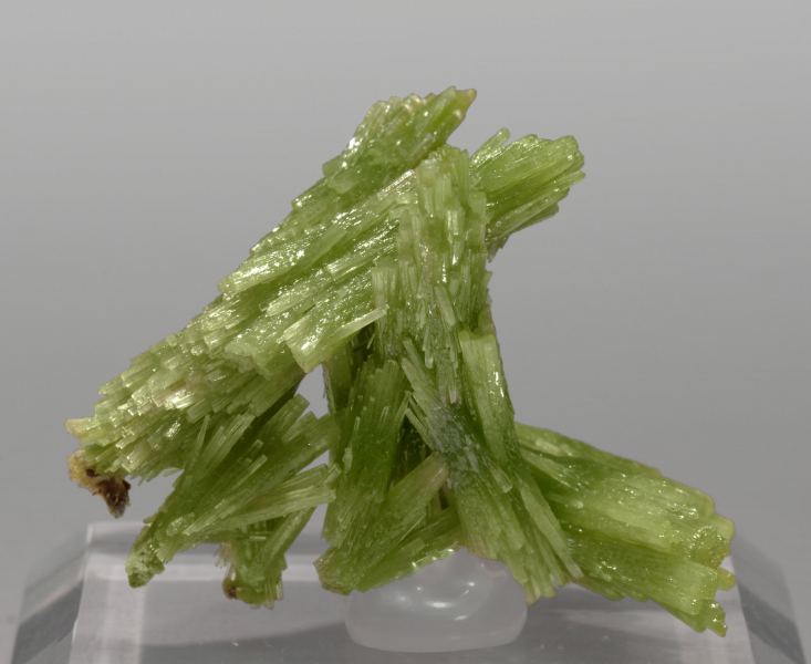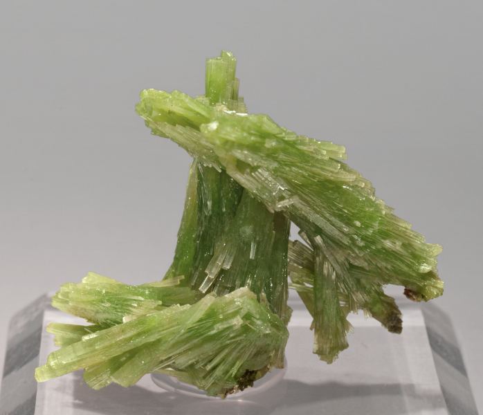 Very aerial miniature formed by divergent aggregates of very elongated prismatic crystals, almost acicular but with good terminations. Those crystals show a good luster and a uniform apple-green color.Daoping Mine, Gongcheng, Guilin Prefecture, Guangxi Zhuang Autonomous Region China (2010)