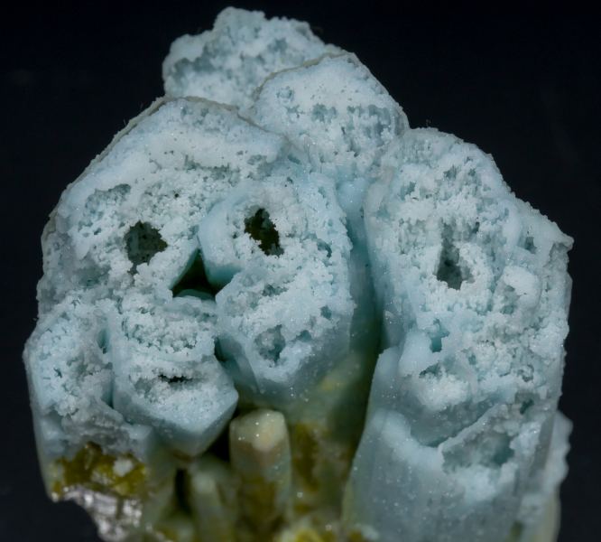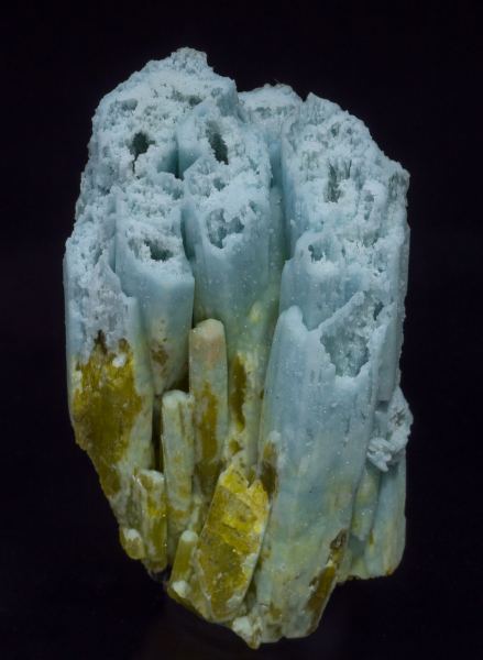 Parallel aggregate of elongated Pyromorphite crystals, some of them doubly terminated, with hollowed terminations and partially coated and embedded by bluish Plumbogummite. The samples are from a very recent find and have different morphological characteristics compared to those previously known. Well send a copy of the analysis to the buyer.Yangshuo / Laohu area, Haiyang Mountains, Guilin Prefecture, Guangxi Zhuang Autonomous Region China (01/2015)