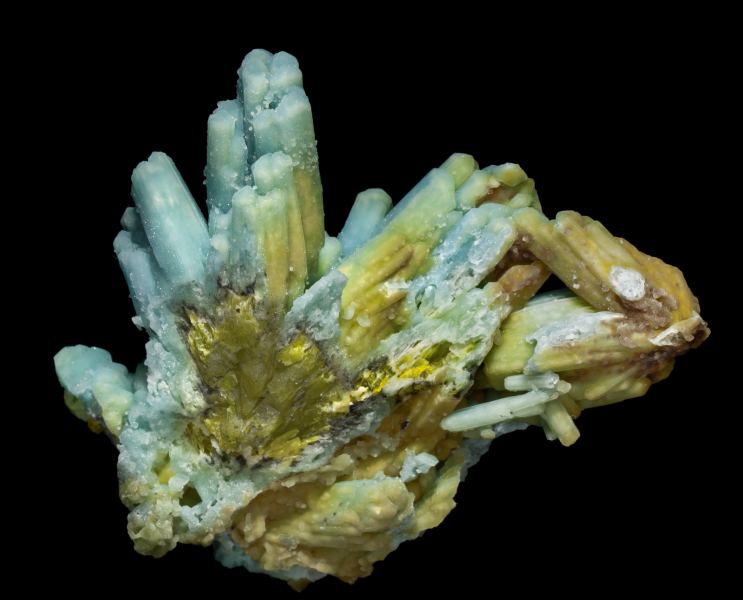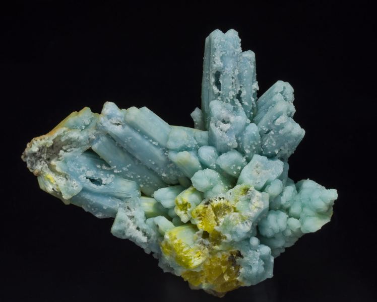 Fanlike aggregate of elongated Pyromorphite crystals with hollowed terminations and partially coated and embedded by intense sky blue Plumbogummite. The samples are from a very recent find and have different morphological characteristics compared to those previously known. Well send a copy of the analysis to the buyer.Yangshuo / Laohu area, Haiyang Mountains, Guilin Prefecture, Guangxi Zhuang Autonomous Region China (01/2015)
