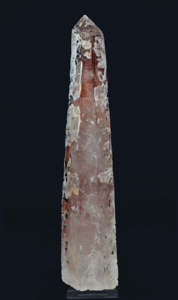 Single crystal of Quartz, very large and also very special for two reasons: it comes from a deposit from which only a few pieces are known and the Hematite inclusions give it a very attractive reddish color. The presence of small Hematite iron roses also completes its appeal.Qagan Obo deposit (Rongguan), Diyanqinamu mining district, East Ujimqin Banner (Dongwu Qi), Xilin Gol League (Xilinguole Prefecture), Inner Mongolia Autonomous Region China (2016)