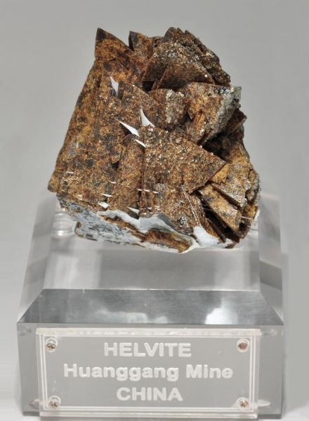 Group of very sharp tetrahedral crystals with very well defined faces and edges. They are brown, with reddish reflections, and are locally coated by small crystals of Quartz. Analysis indicates that it is really Helvine, both externally and in the interior. We'll send both analytical results (external and internal) to the buyer.Huanggang Mines, Hexigten Banner (Kèshíkèténg Qí), Chifeng (Ulanhad), Inner Mongolia Autonomous Region China (2011)