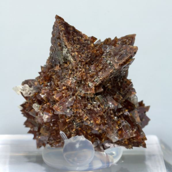 Aggregate of very sharp tetrahedral crystals, bright with dark a brown color and with small parallel Quartz aggregates. They are between transparent and translucent, as the picture under intense light shows, and this confers a special quality to the samples from this cavity. The sample has been analyzed showing dominant Helvine forming a solid solution with Genthelvite. We will send a copy of the analysis to the buyer.Huanggang Mines, Hexigten Banner (Kèshíkèténg Qí), Chifeng (Ulanhad), Inner Mongolia Autonomous Region China (2013)
