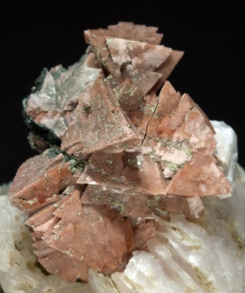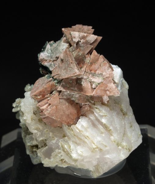 Very aerial group, on a Calcite matrix, of very sharp tetrahedral crystals with a clear salmon color and zonal growth. The analysis indicates that both the external zone and the inner crystal are Genthelvite. Well send a copy of both analyses to the buyer.Huanggang Mines, Hexigten Banner (Kèshíkèténg Qí), Chifeng (Ulanhad), Inner Mongolia Autonomous Region China (±2012)