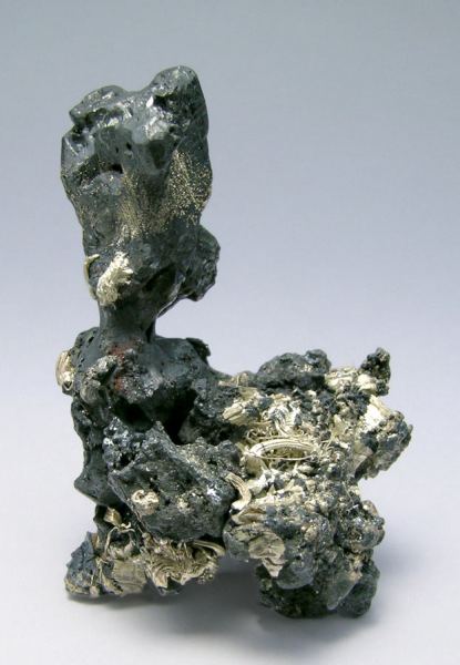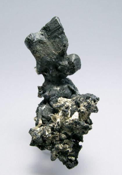 Very stylized group of deformed cubic crystals. Hooked and coiled wirelike crystals of native Silver contrast with the darker Acanthite.66 line Mine, Gaoliangchun, Lingqiu, Datong Prefecture, Shanxi Province China (2007)